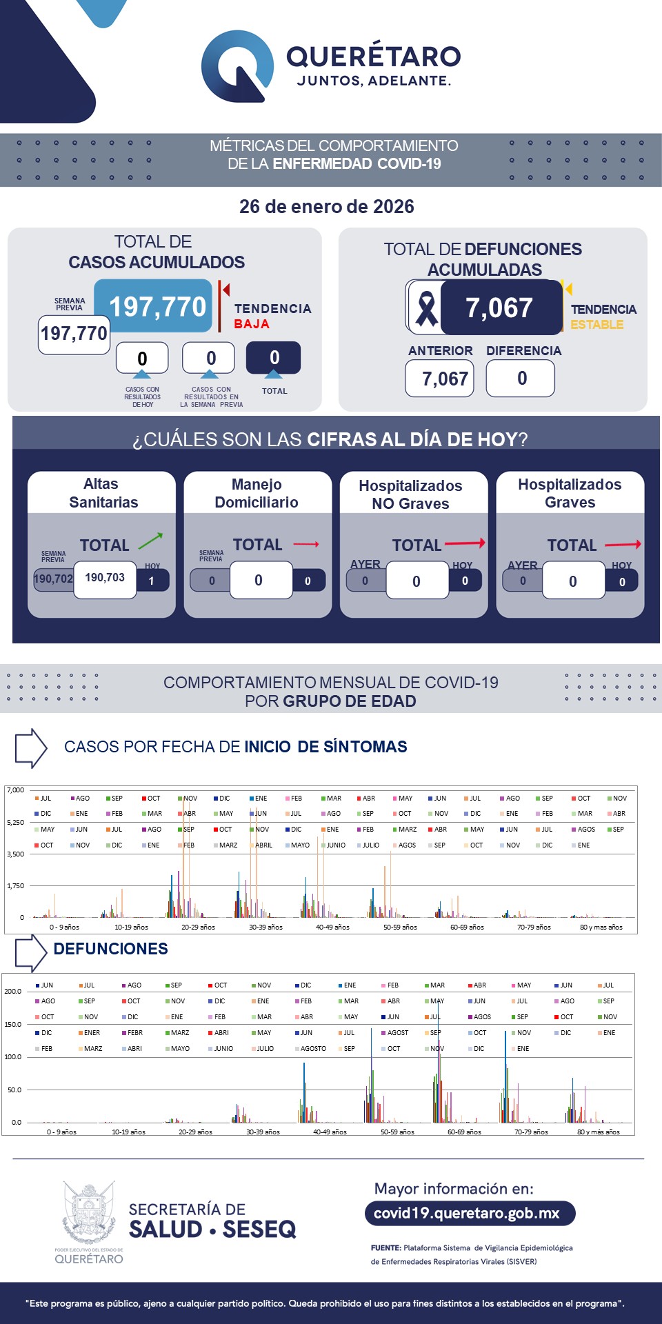 La Secretaría de Salud del estado de Querétaro informó que en los últimos siete días no se han registrado nuevos casos ni defunciones por COVID-19, por lo que actualmente la entidad no presenta casos activos de la enfermedad.